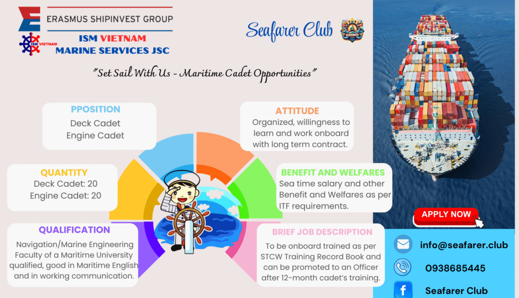HOT TUYỂN DỤNG – CƠ HỘI LÊN TÀU QUỐC TẾ CÙNG ISM VIETNAM! ISM Vietnam Marine Services JSC – thành viên của Erasmus Shipinvest Group, đang tìm kiếm 40 gương mặt sáng giá nè các bạn sinh viên hàng hải ơi! Vị trí tuyển dụng: Deck Cadet: 20 Engine Cadet: 20 Cơ hội tới rồi, còn chờ gì nữa các […]