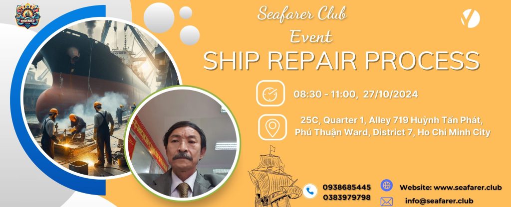 SHIP REPAIR PROCESS Are you seeking an opportunity to understand the ship repair process better and meet top industry experts? Don’t miss the “Ship Repair” event at Seafarer Club! Speaker: Mr. Lê Lộc – Ship Repair Expert Time: 08:30 – 11:00, Sunday, October 27, 2024 Location: 25C, Quarter 1, Alley 719 Huỳnh Tấn Phát, Phú Thuận Ward, District 7, Ho Chi Minh City This event will feature valuable discussions and experiences shared by experts and ship repair facilities in Vietnam. Register today to secure your spot! Limited seating is available. Contact & Register: https://forms.gle/8EF5UmyDUjdA5fQH8 Seafarer Club looks forward to welcoming you!