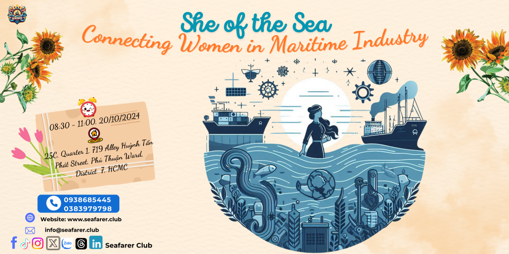 SHE OF THE SEA – CONNECTING WOMEN IN MARITIME INDUSTRY Are you ready to explore the ocean and connect with amazing women in the maritime industry? 📅 Time: 08:30 – 11:00, October 20, 2024 📍 Location: 25C, KP1, Alley 719 Huỳnh Tấn Phát, Phú Thuận Ward, District 7, Ho Chi Minh City Special Guests: Female captains, seafarers, seafarers’ families, and women working in the maritime sector. Special Offer: Women attending on October 20 will receive a FREE juice from Seafarer Club as a thank-you gift for the first 5 participants! 🍹 Exciting Content: Build & Expand Professional Networks: Meet and learn from women in the maritime field. Share Knowledge & Skills: Receive valuable advice and inspiring stories for the next generation of women in maritime. Explore New Career Opportunities: Seize opportunities to develop your career in the dynamic and challenging maritime industry. Don’t miss this amazing opportunity! Join us to celebrate the resilience and achievements of women in the maritime industry. 🌐 Contact & Register: [Registration link] Let’s venture into the vast ocean together and conquer new challenges!
