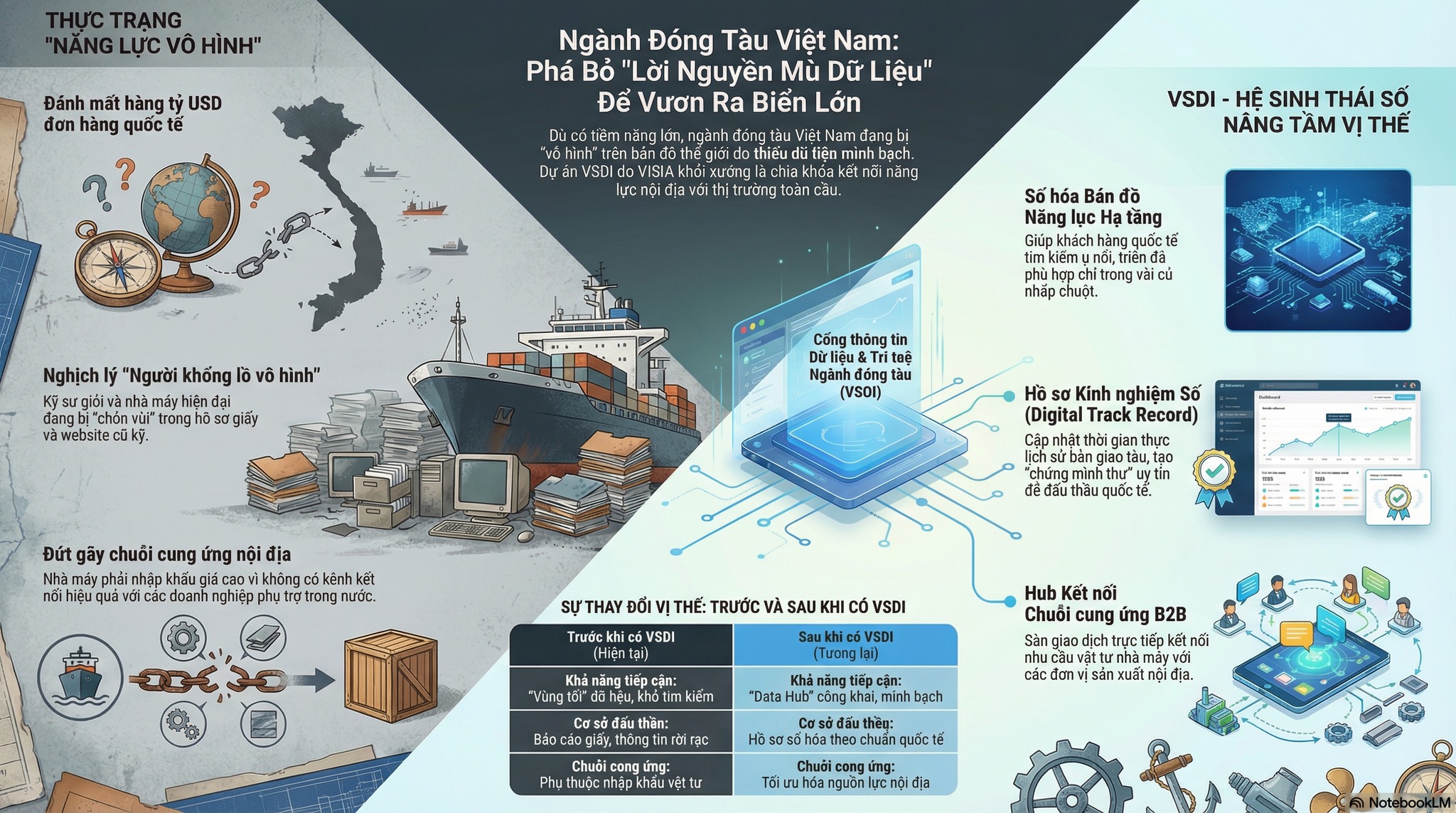Nhận diện “lỗ hổng chiến lược” này, Hội Khoa học Kỹ thuật Tàu thủy Việt Nam (VISIA) đang đứng trước một sứ mệnh lịch sử tại Hội nghị lần này. Đó là việc khởi xướng dự án “Cổng thông tin Dữ liệu & Trí tuệ Ngành đóng tàu Việt Nam” (VSDI – Vietnam Shipbuilding Database & Intelligence).